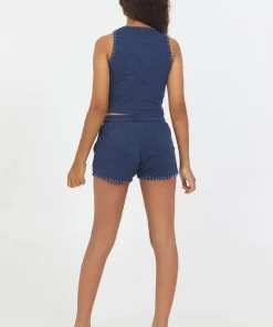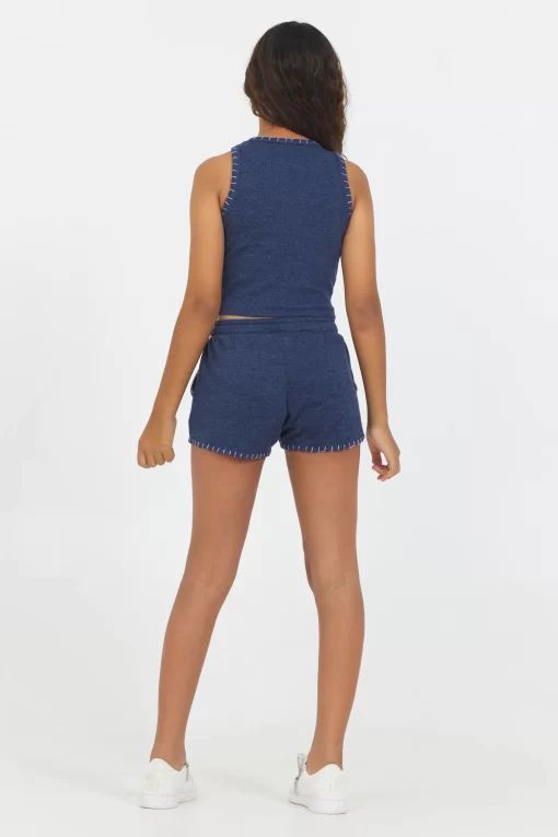 This Navy Bow Stitch Tank combines elegant stitch detailing with a playful bow print pattern. The versatile tank silhouette makes it perfect for layering or wearing solo during warmer months.