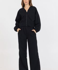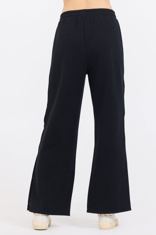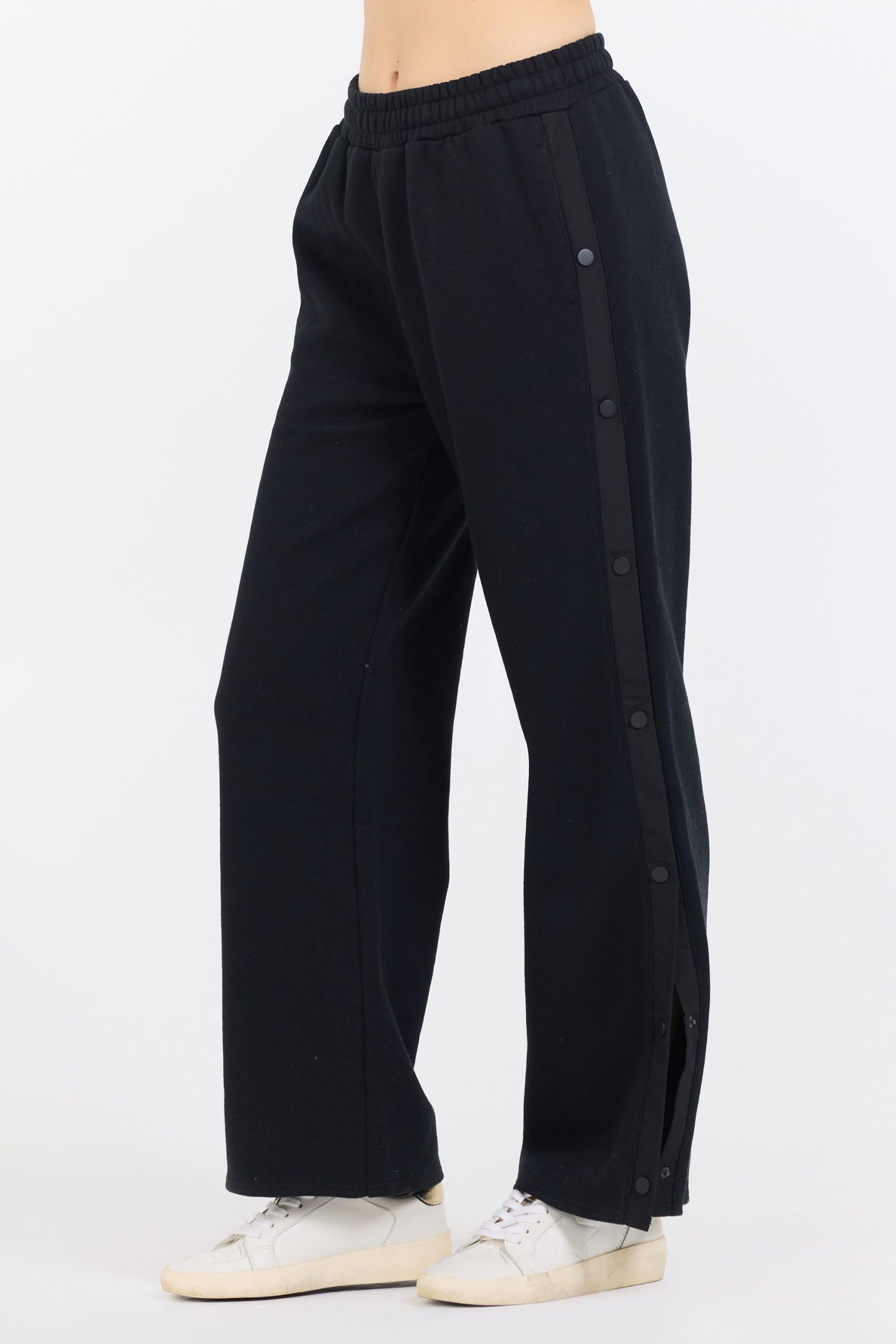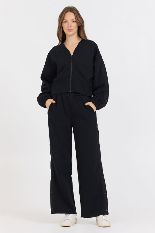 The Black Brushed Snap Pant combines comfort and style with its soft brushed fabric made from a durable 65% cotton and 35% polyester blend. Designed for easy wear, these pants feature convenient snap closures and are machine washable in cold water with like colors, ensuring effortless care and lasting quality. Perfect for a casual yet polished look.