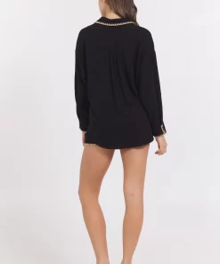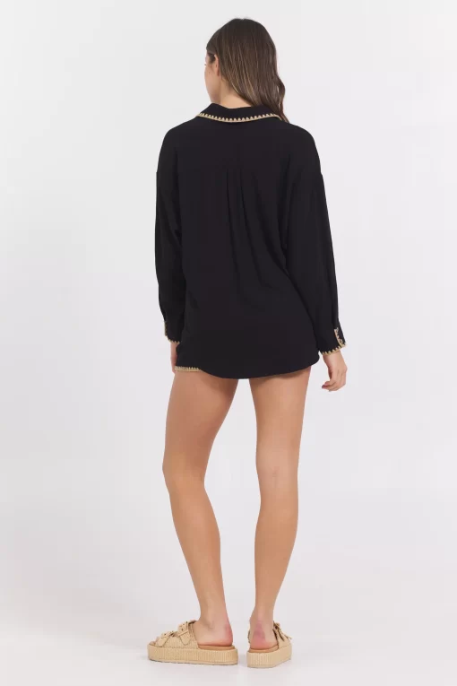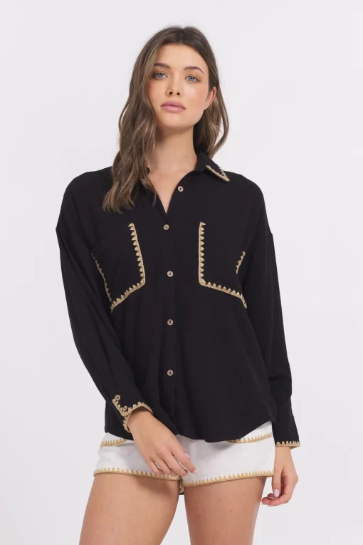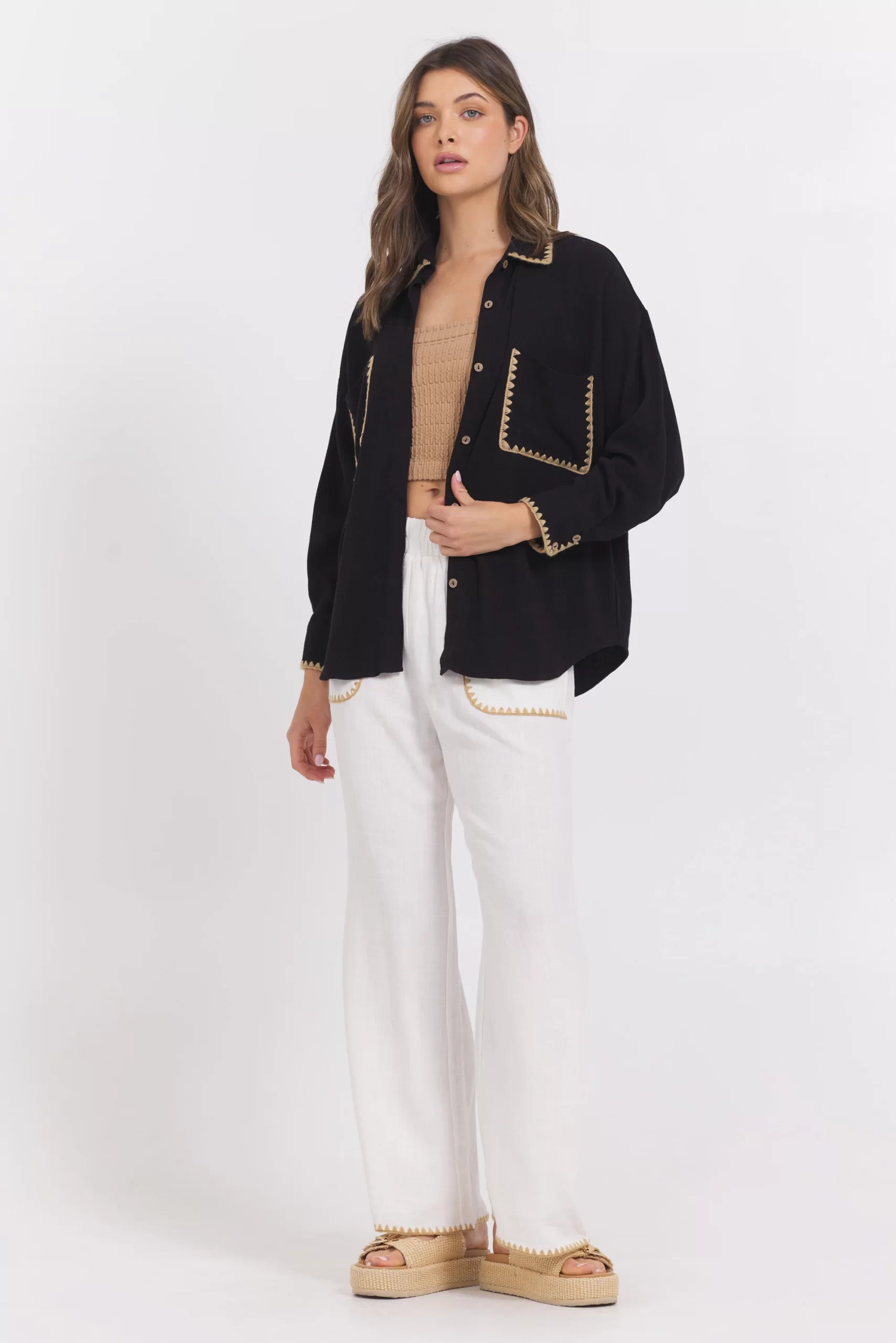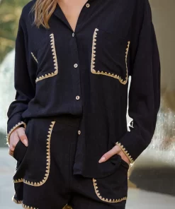 This Black Button Up Shirt with Tan Whip Stitch combines classic button-up design with subtle stitch detailing for a refined yet relaxed look. The tan whip stitch adds a distinctive touch, enhancing the shirt’s style without overpowering it. Perfect for both professional settings and casual outings, it offers versatility and understated sophistication.