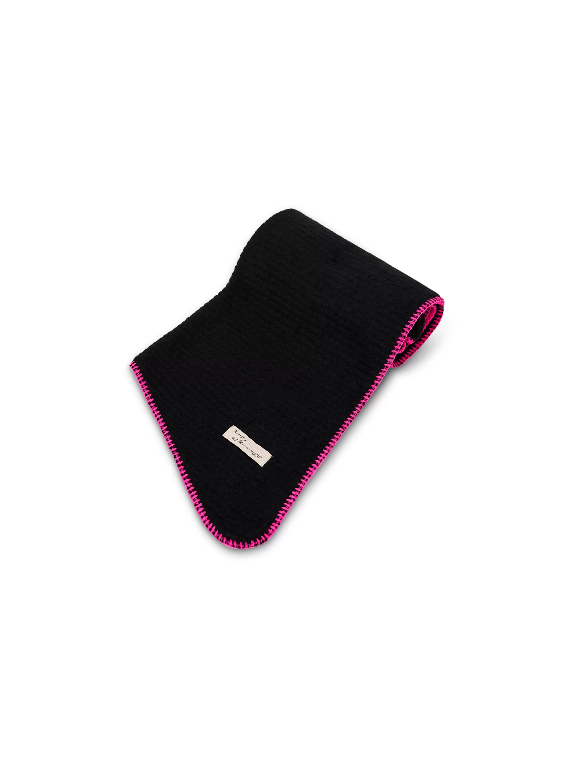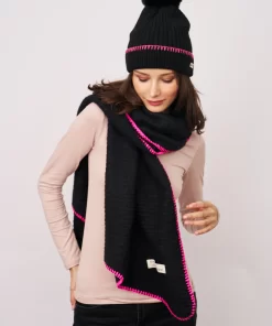 This Blanket Stitch Knit Scarf in Black and Pink features a stylish whipstitch trim that adds a subtle handcrafted touch. Made from 100% recycled polyester, it offers a soft, cozy feel while supporting sustainable fashion. Perfect for adding warmth and a pop of color to your everyday wardrobe with an eco-conscious edge.
