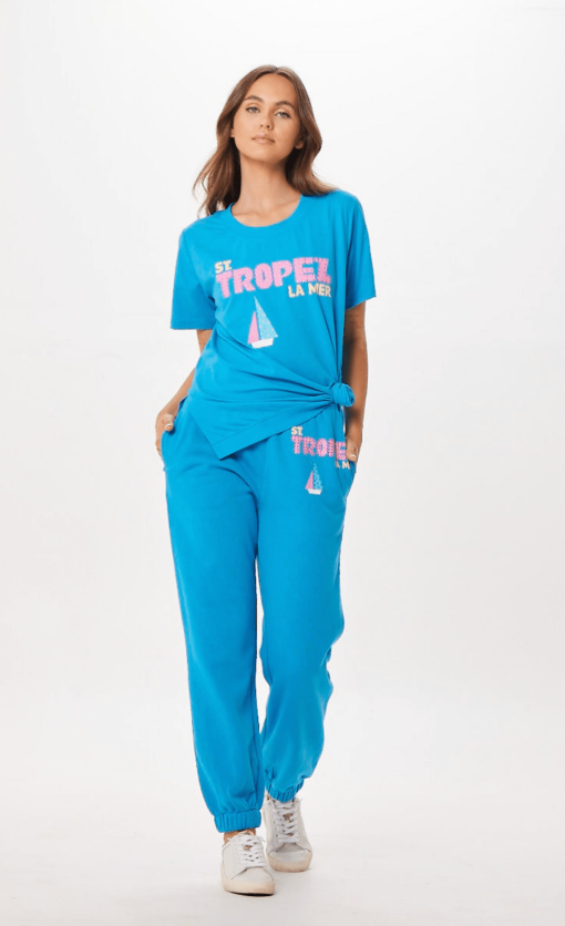 The Bright Blue St. Tropez Jet Setter Surf Wash Jogger combines comfort and style with its elastic waistband for a perfect fit and easy wear. Featuring a distinctive “St. Tropez” graphic and subtle gem details, this jogger adds a touch of sophistication to your casual wardrobe. Ideal for relaxed days or travel, it offers both functionality and a fashionable edge.