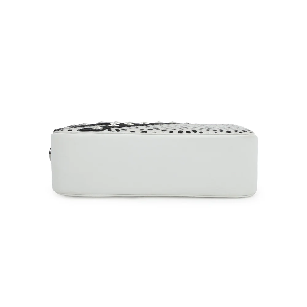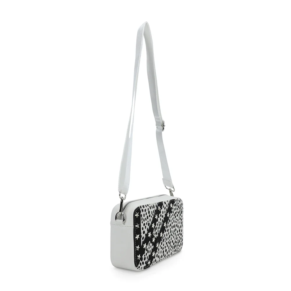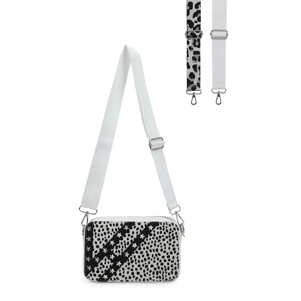 The Joyce Bag in White Cheetah combines style and practicality with its adjustable crossbody strap, allowing for a comfortable, customized fit. The subtle star detail adds a unique touch, making this bag a versatile accessory for everyday wear or special occasions.