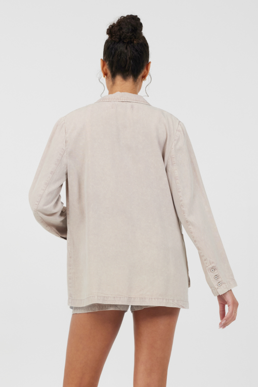 The Khaki Tencel Blazer offers a relaxed fit that ensures comfort throughout the day. Crafted in a versatile khaki shade, it features practical cargo-style pockets that blend functionality with style. This blazer is an ideal choice for those seeking a polished yet effortlessly casual look.