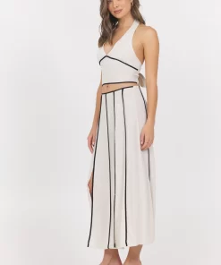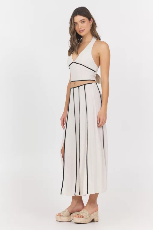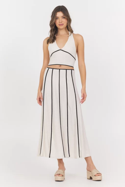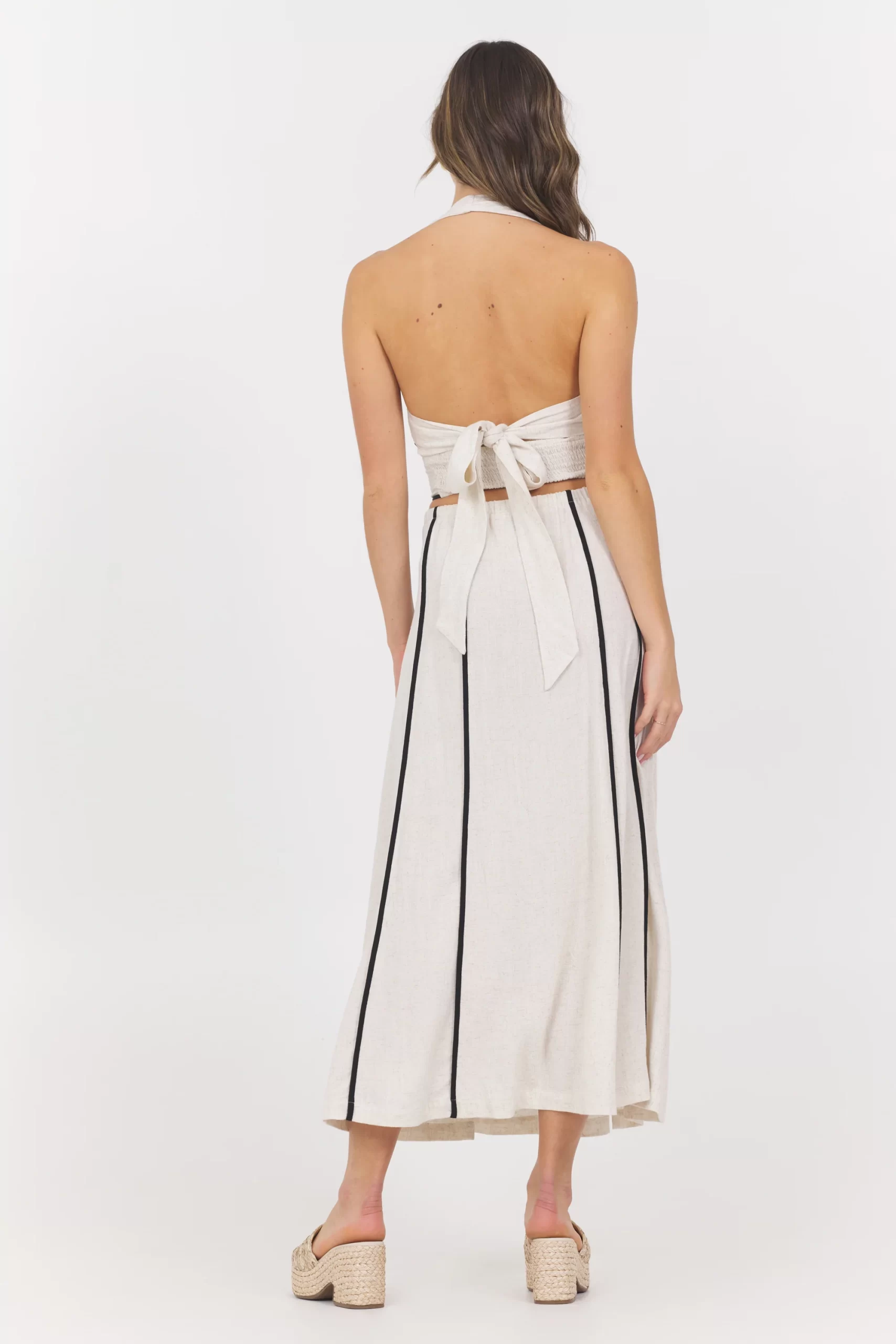 Crafted from breathable linen blend fabric, this halter top offers a comfortable fit perfect for warm days. The halter neckline highlights your shoulders, while the subtle piping detail adds a refined touch to a casual silhouette. Ideal for effortless style with a polished edge.
