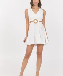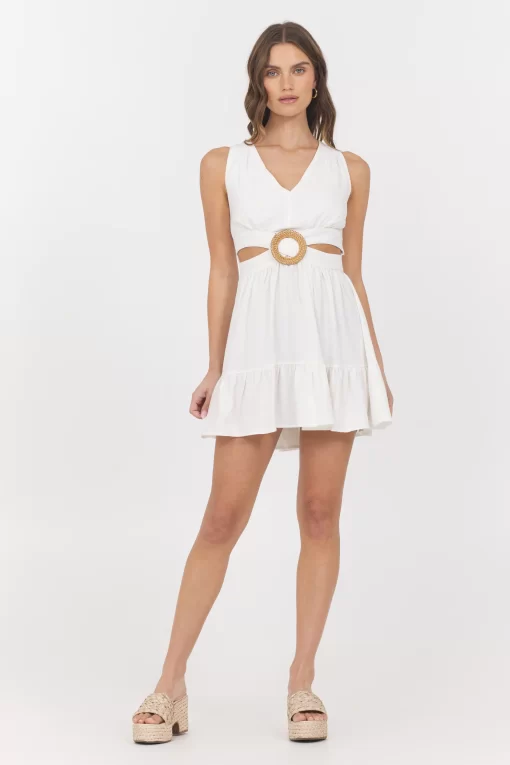 This linen dress features a flattering V-neckline and unique cutout detailing, enhanced by a stylish wooden O ring accent. Its breathable fabric and thoughtful design make it a comfortable yet chic choice for warm days or casual outings.