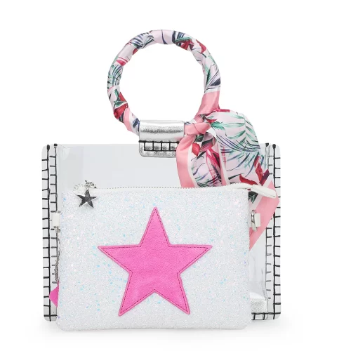 The Mini Molly in Scarf Pink Mix combines style and practicality with a top strap and a convenient crossbody strap for versatile carrying options. Its pull-to-close design ensures secure storage, while the star detail inside the zipper pouch adds a subtle touch of charm. Finished with a coordinating scarf, this bag offers a polished yet casual look perfect for everyday use.