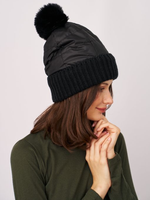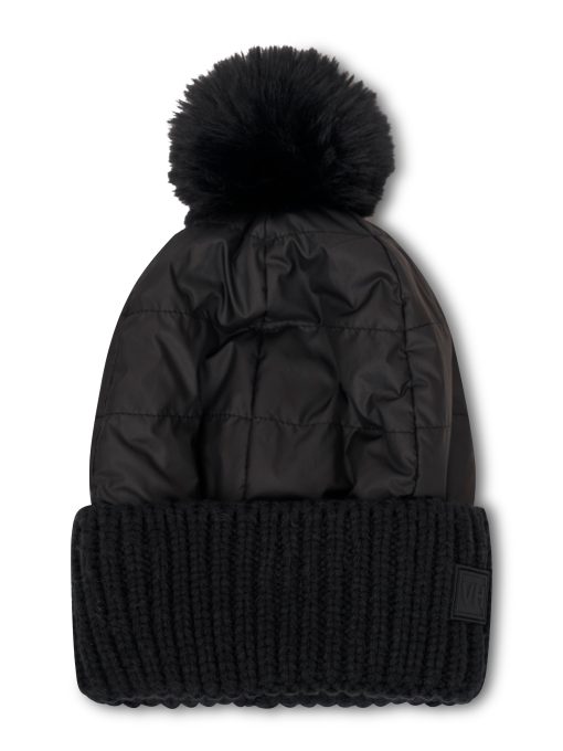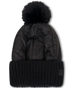 This black puffer pompom hat combines warmth and style with its quilted nylon shell and soft polyester lining. The ribbed cuff, made from a comfortable acrylic blend with a touch of elastane, ensures a snug fit. Finished with a playful polyester pompom, this hat is perfect for keeping cozy during chilly days while adding a casual, polished touch to your winter wardrobe.
