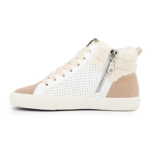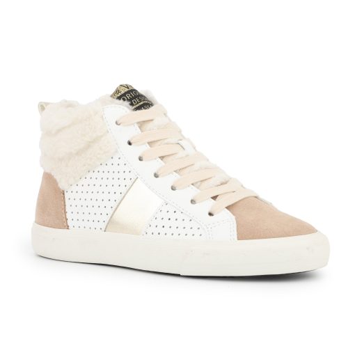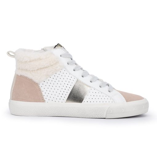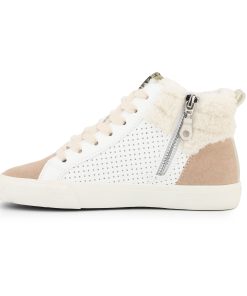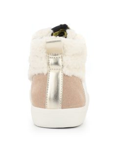 These hi-top kids’ shoes combine easy slip-on styling with a secure fit—no laces needed. Designed to fit true to size, they offer both convenience and comfort for active children. The white, camel, and gold color scheme adds a stylish touch suitable for everyday wear.