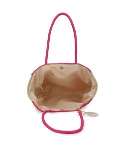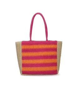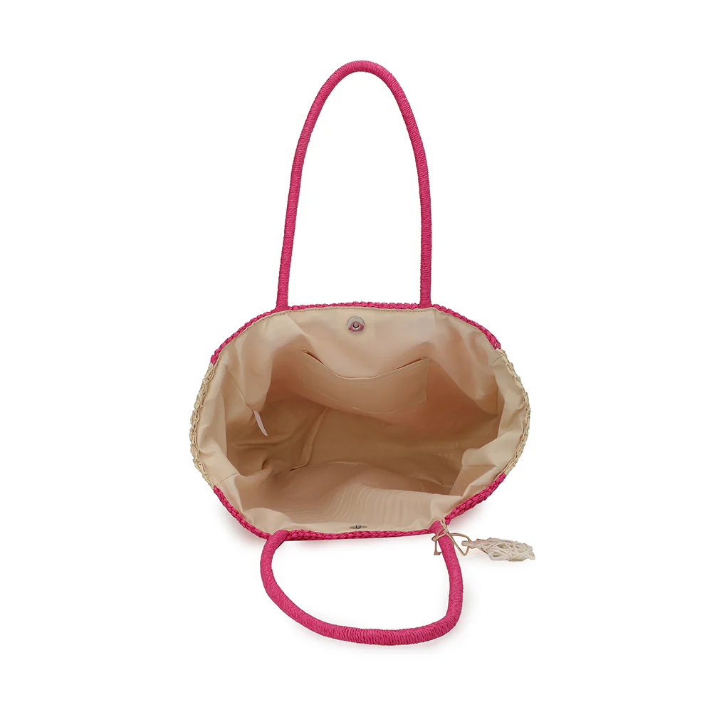 This Slam Bag 3 in pink and peach combines a stylish crochet design with a convenient top handle tote shape. The subtle star detail adds a unique touch, making it a versatile accessory for everyday use. Its lightweight construction ensures easy carrying while maintaining a chic, casual look.