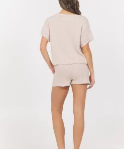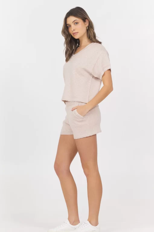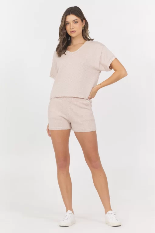 The Summer Sand White Short Sleeve Sweater with Whipstitch combines a classic V-neck design with subtle whipstitch detailing for a refined yet relaxed look. Its lightweight fabric makes it perfect for warm weather, offering both comfort and style for everyday wear.