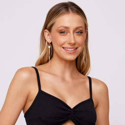 The Teagan Earrings combine elegance and durability with 18K gold-plated copper and a sterling silver post, making them safe for sensitive ears. Measuring 3.94 inches in height and 0.6 inches in width, these lightweight earrings resist tarnish and are waterproof for everyday wear. To keep their shine, avoid contact with soaps, perfumes, and lotions, and polish gently with a lint-free microfiber cloth. Perfect for adding a refined touch to any outfit while ensuring comfort and longevity.