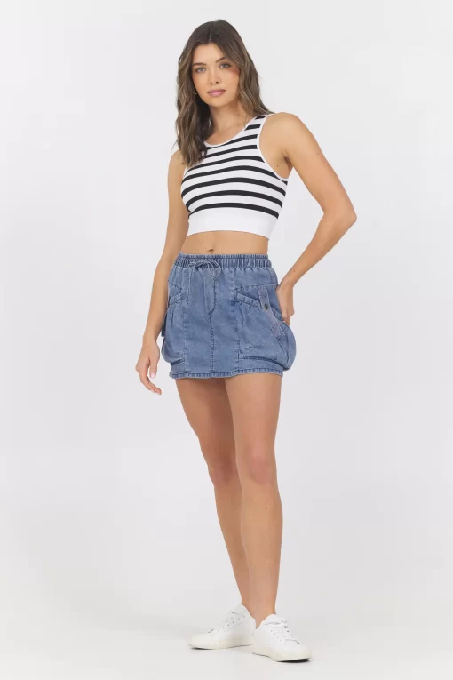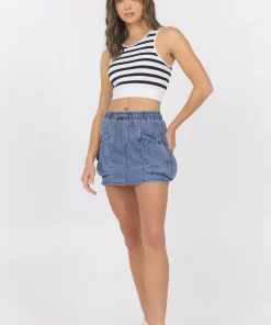 The Washed Denim Tencel Bubble Skort combines comfort and style with its elastic and tie closure for a customizable fit. Crafted from soft Tencel fabric, it features convenient side pockets, making it perfect for everyday wear with a relaxed yet polished look.