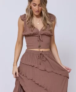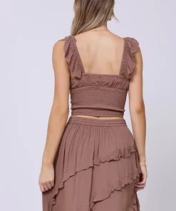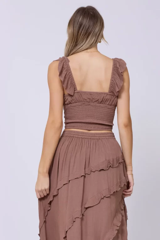 The Washed Mocha Rayon Crinkle Flutter Sleeve Top offers a stylish cropped fit with a flattering tie front detail. Its smocked design ensures a comfortable, flexible wear, while the flutter sleeves add a soft, feminine touch. Crafted from breathable rayon with a subtle crinkle texture, this top combines effortless elegance with everyday comfort.