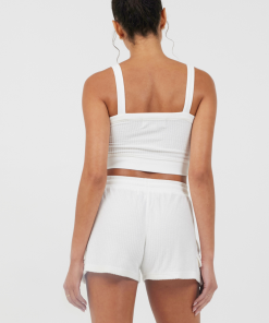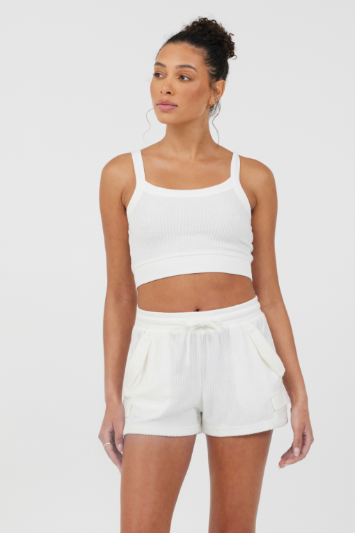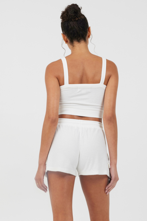 The White Cord Terry Tank offers a modern cropped fit crafted from soft cord terry fabric, providing both comfort and style. Its scoop neck design adds a flattering touch, making it a versatile piece perfect for layering or wearing on its own during warmer days. Ideal for a casual yet polished look.
