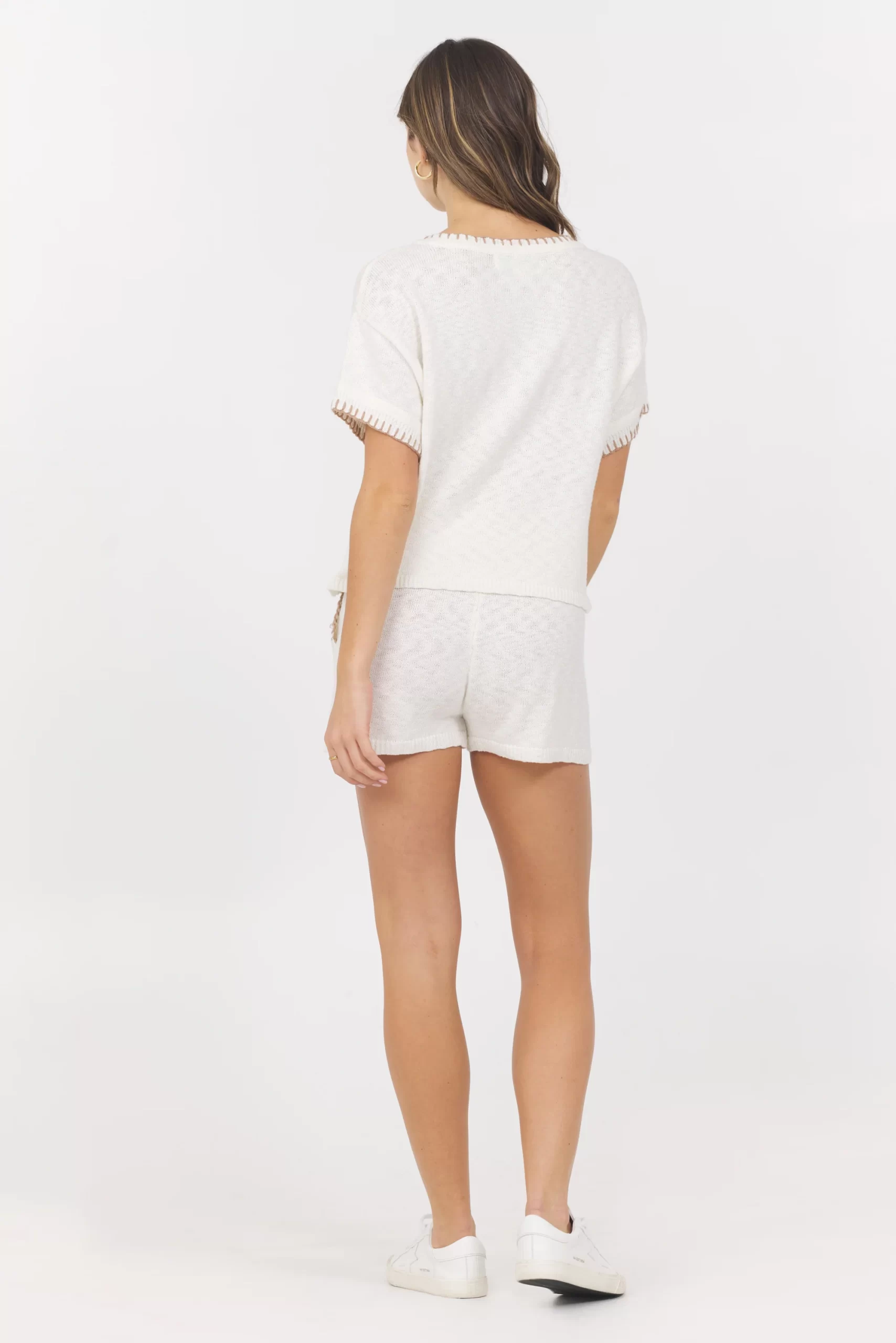 The Short Sleeve Sweater w/ Whipstitch features: