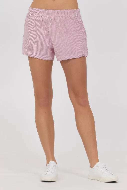 The Woven Boxer Short in Strawberry Stripe offers a comfortable fit with its elastic waistband and breathable woven fabric. Designed for everyday wear, these shorts combine ease and style, making them a versatile addition to your casual wardrobe.